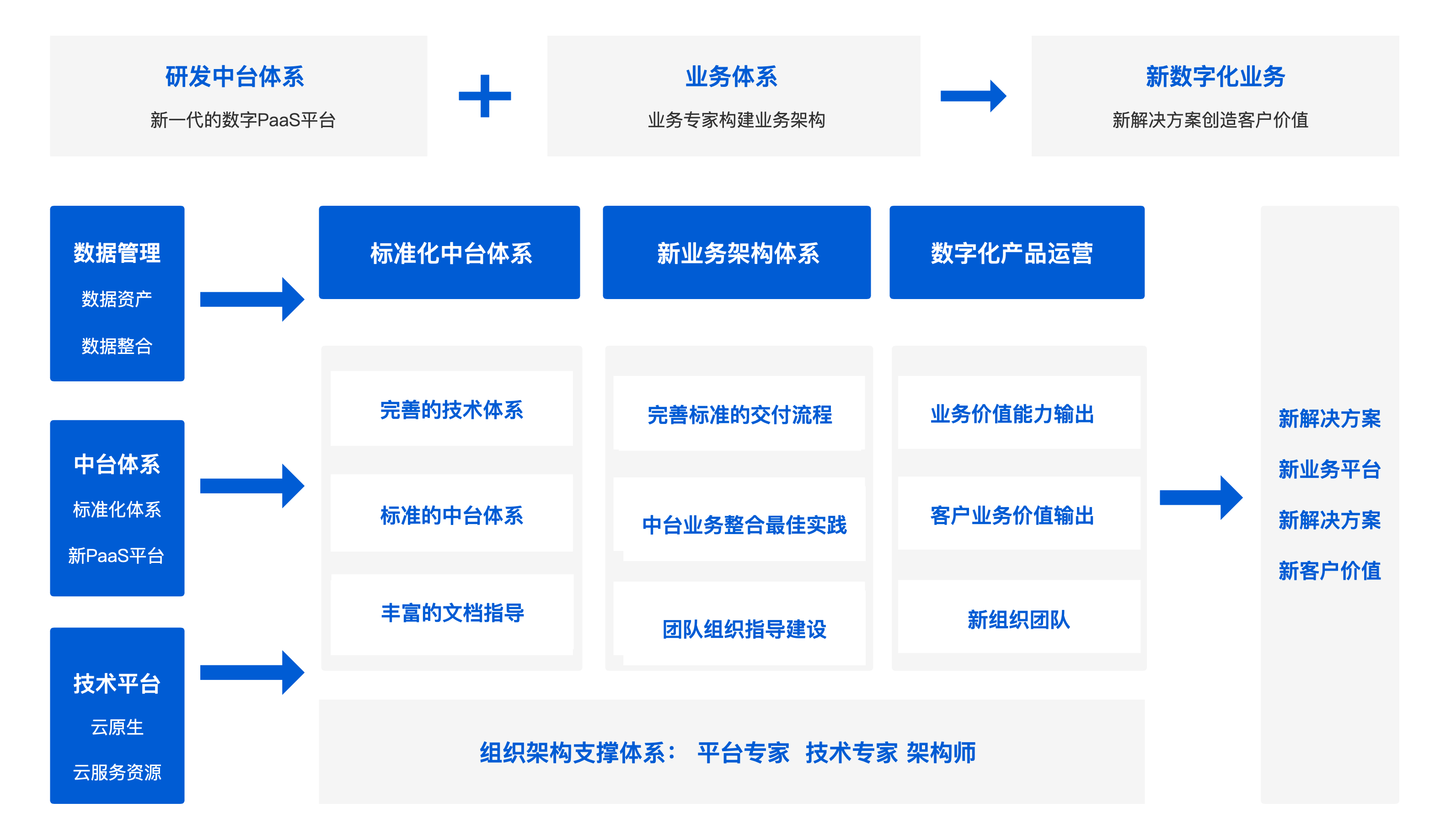 包含平台化、中台化、保障体系,支持技术、研发、标准、数据、运营一体化的中台建设体系,业务应用生命周期管理和监控的新一代中台。