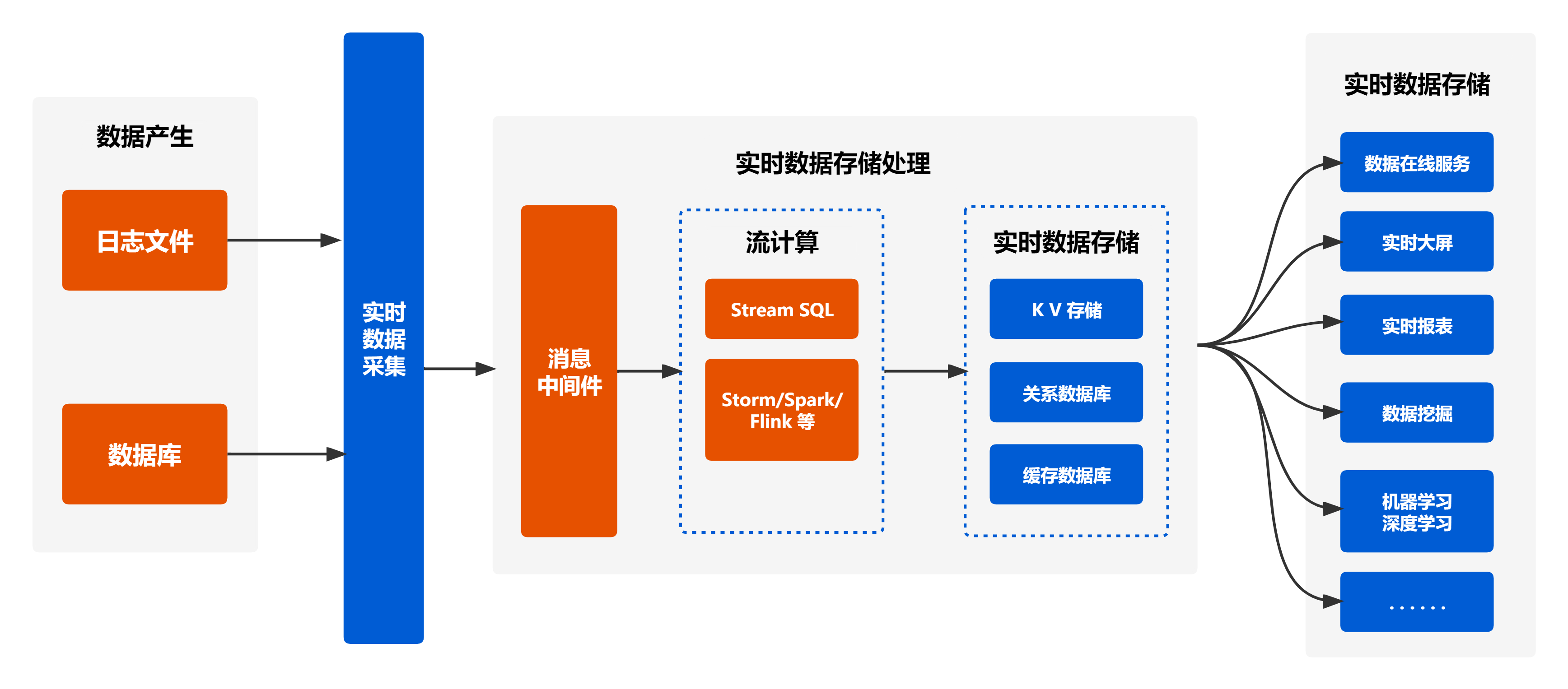 实时数据采集(如 Flume),消息中间件(如 Kafka)、流计算框架(如 Strom、Spark、Flink 和 Beam 等), 以及实时数据存储(如列族存储的 HBase)