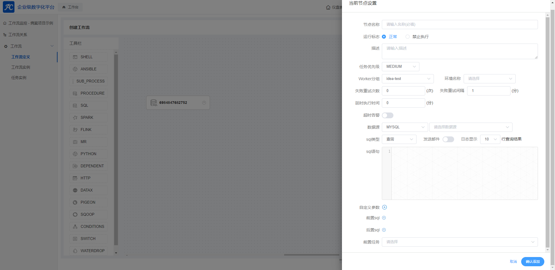 根据需求通过拖拉拽的方式,将左侧工作栏中的控件拖入画布。如拖一个sql控件到画布中