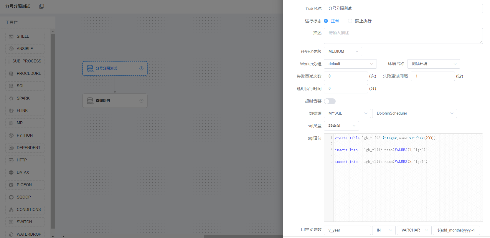 数据源选择hive,数据源中心中创建的数据源;sql类型选择非查询;根据需求填写其他信息,如sql语句、自定义参数、前置sql、后置sql、前置任务