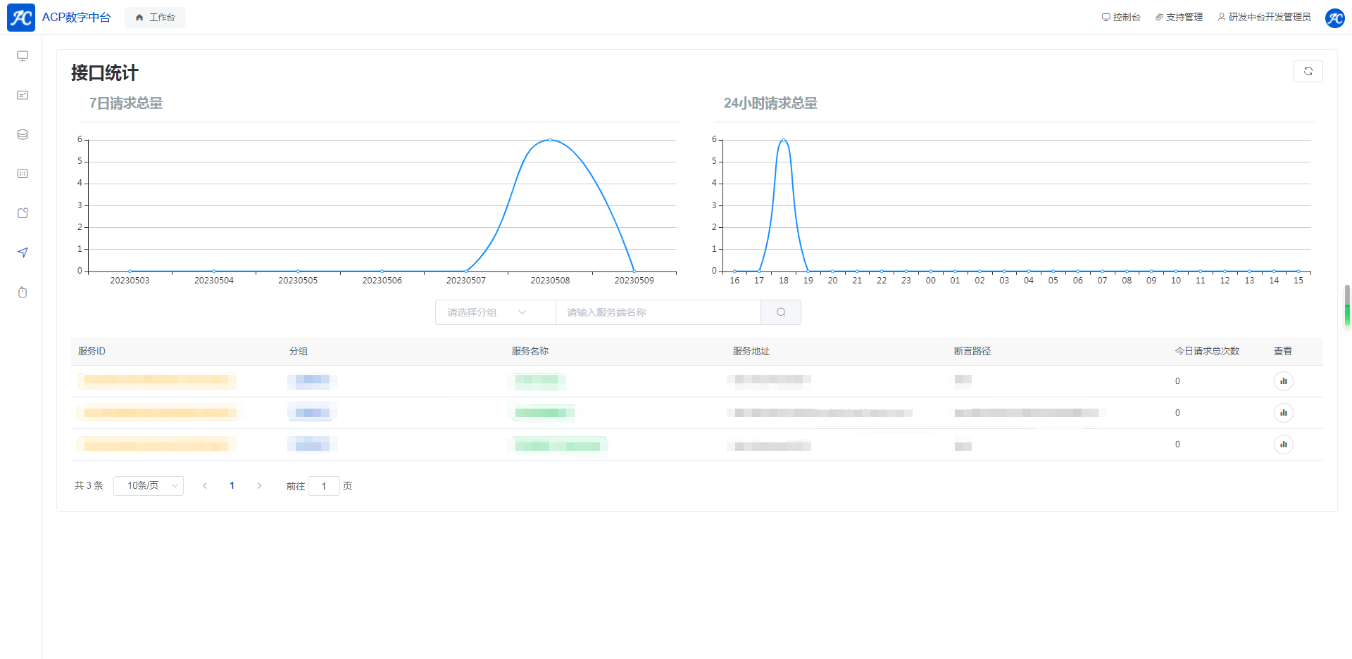 显示当前用户各个接口,可通过图表查看接口总请求量统计和单个接口请求量统计