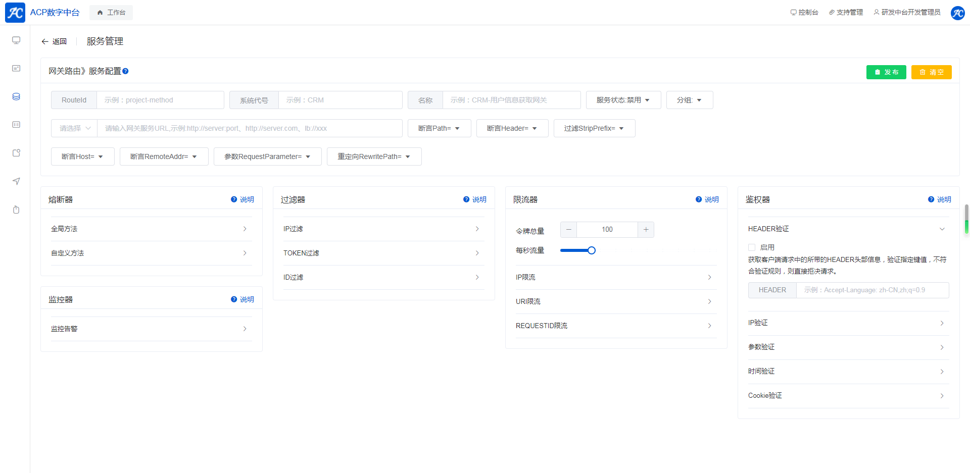 通过对网关路由维护与管理,实现路由、过滤器、熔断、鉴权、限流、日志、监控等功,在服务管理上进行路由配置