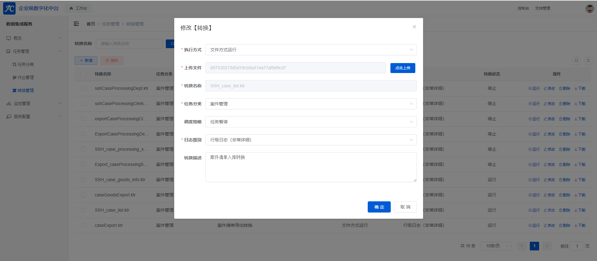 进入数据集成服务,导航到任务管理-转换管理,新增转换记录