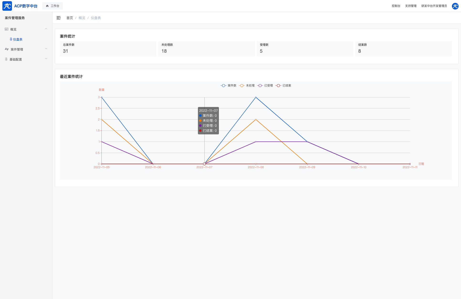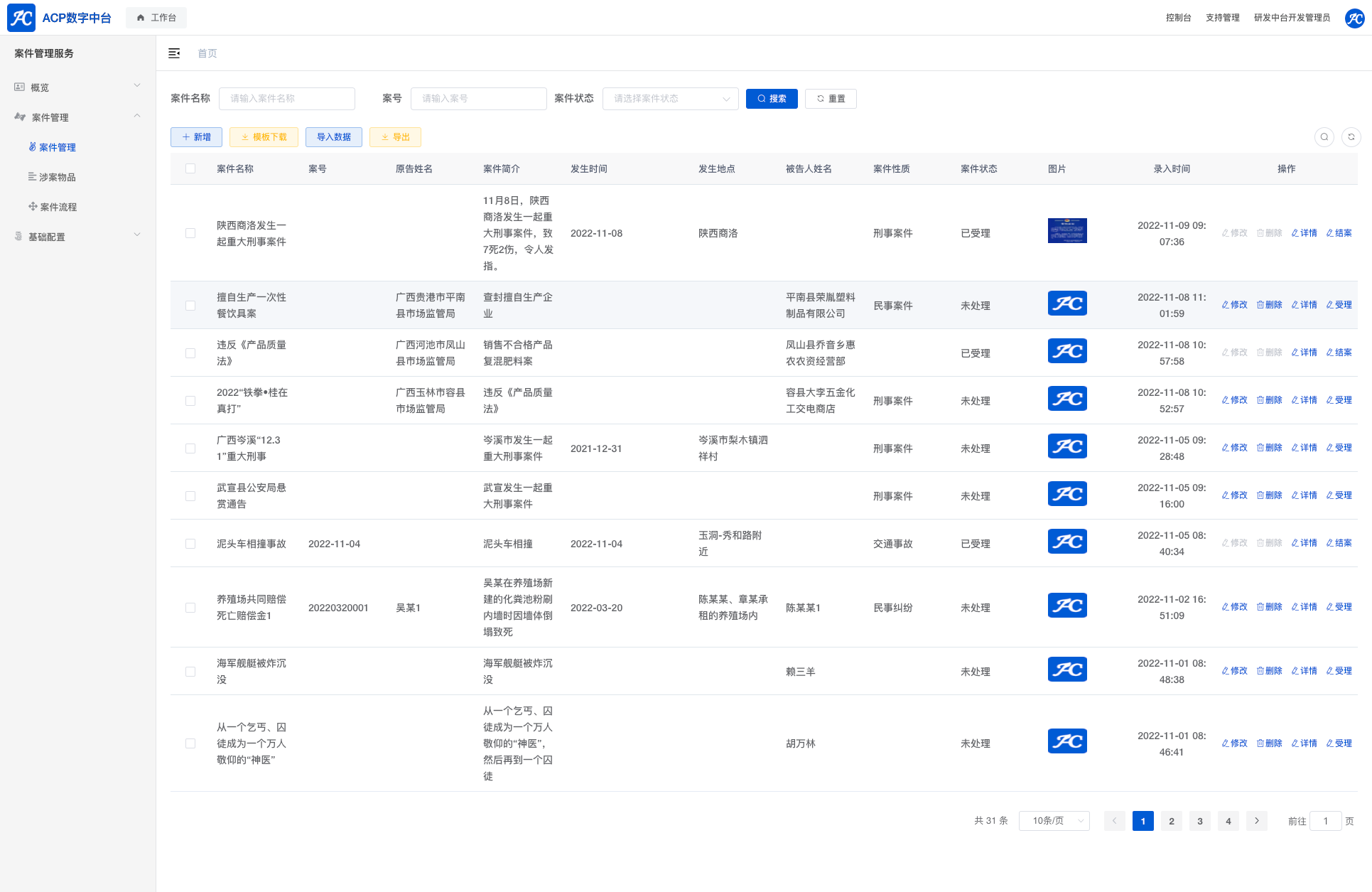 案例管理系统是一个对业务案例的管理,包括案件的CURD管理,案件统计,图片文件管理,数据导入导出等常见功能, 包括多账号权限管理,权限配置配置等。