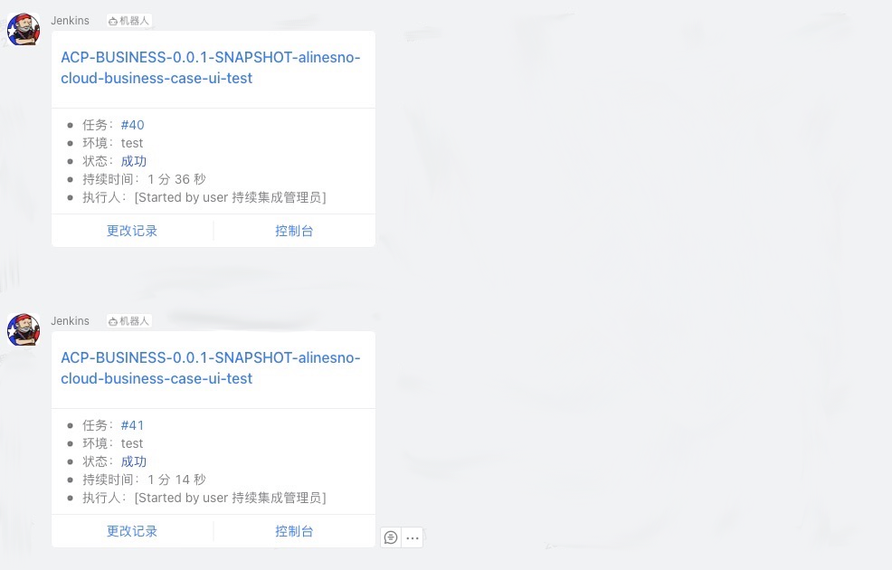 集成前后端发布和集成阿里云容器,同时在发布成功或者失败之后,集成钉钉通知,效果如下: