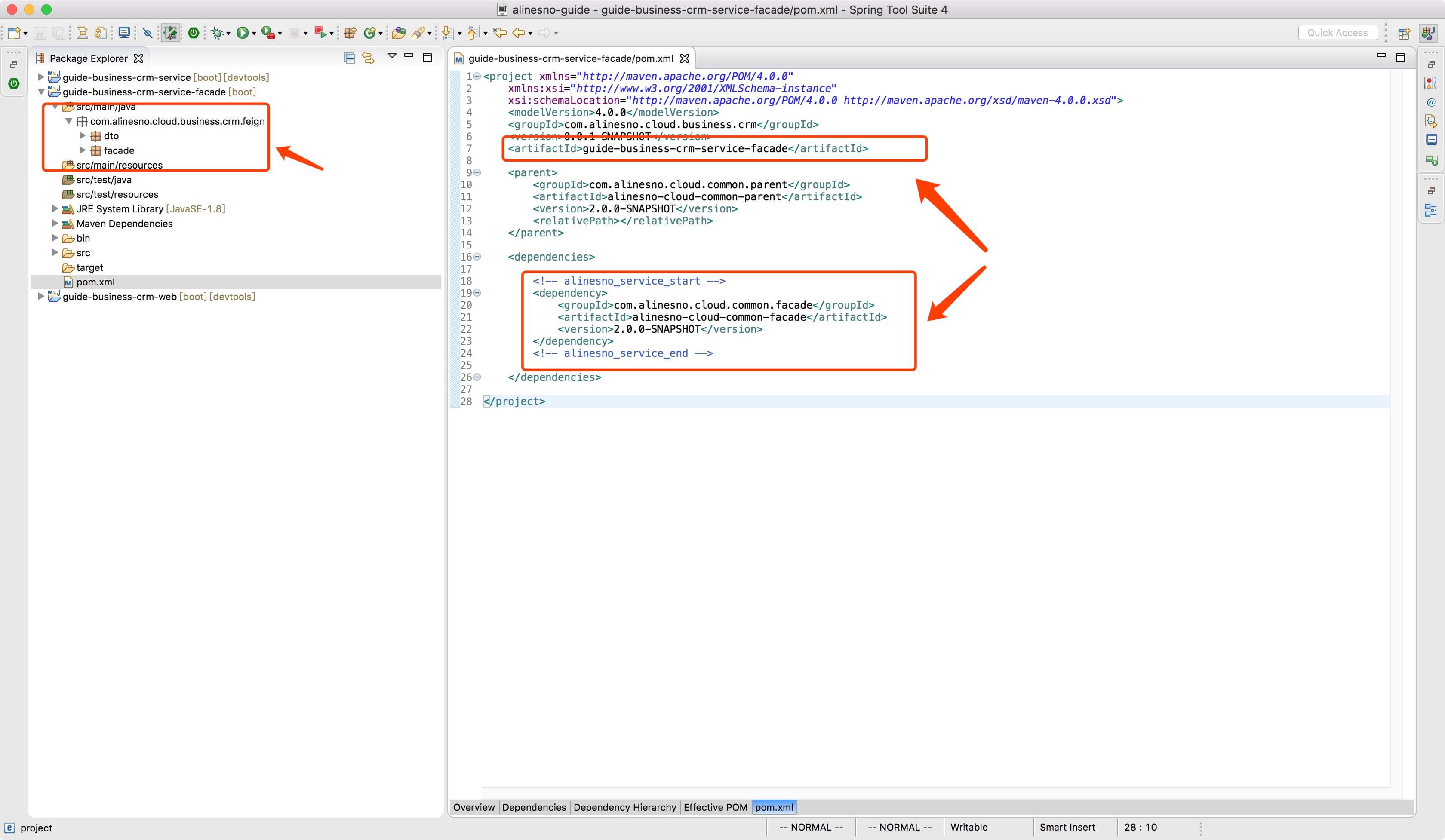 对 pom.xml 文件说明,feign 对外接口 pom.xml 只需要,依赖一个 jar 包即可,同时调整artifactId,具体请看上图