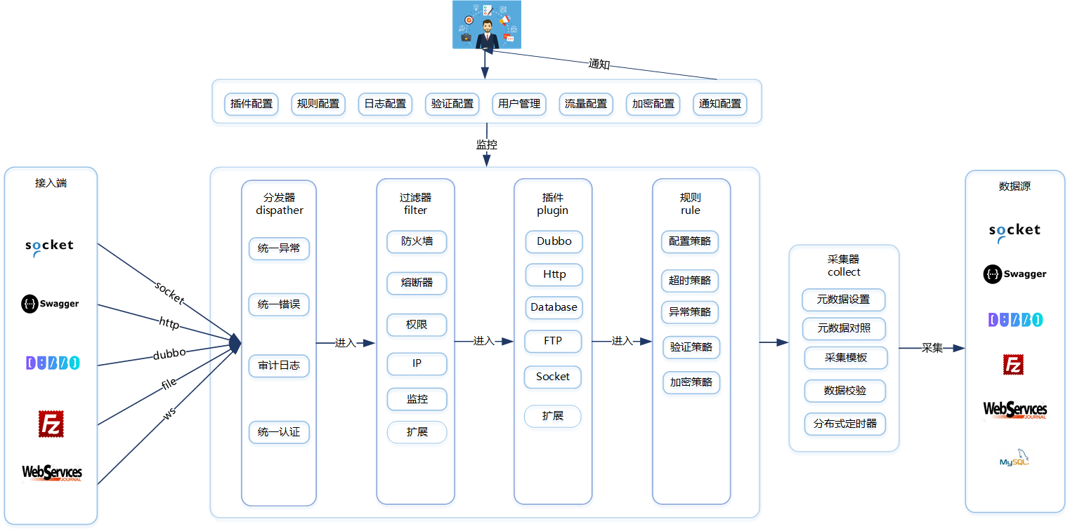 作为所有后端业务服务的聚合点,所有的业务服务都可以在这里被调用;