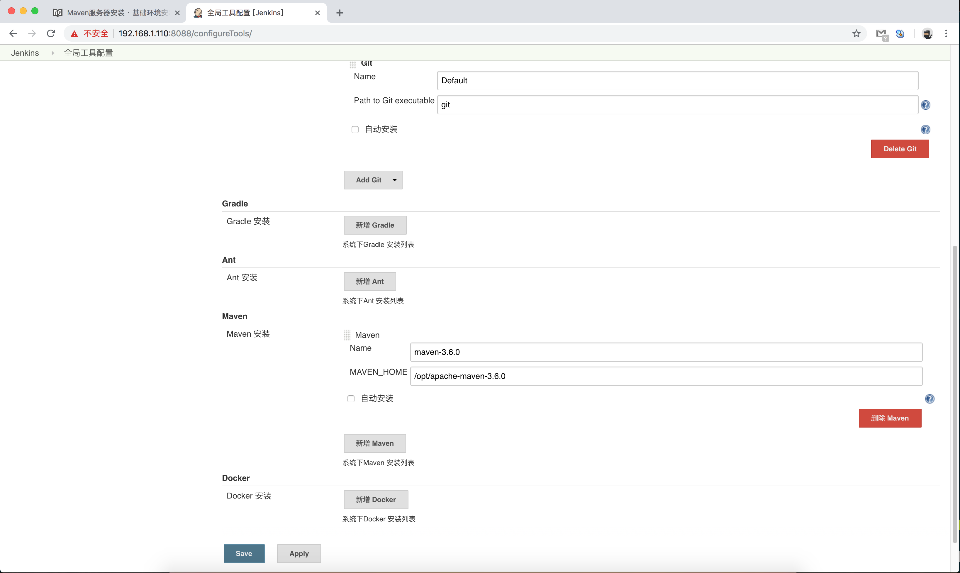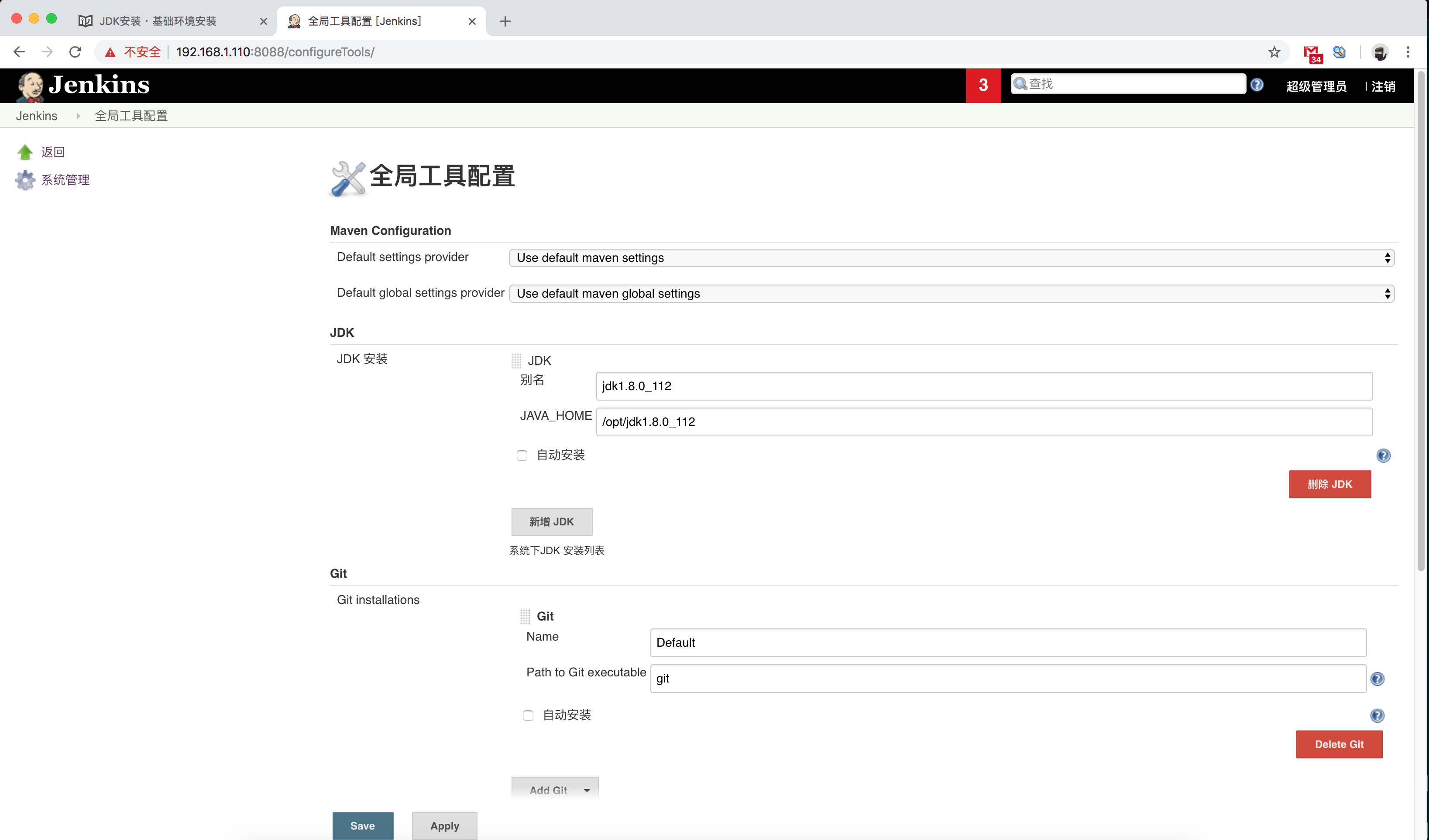 Jenkins 可以配置多个 jdk 供用户在构建过程中提供选择,此处我们统一了 jdk 版本,所以只需要配置一个即可