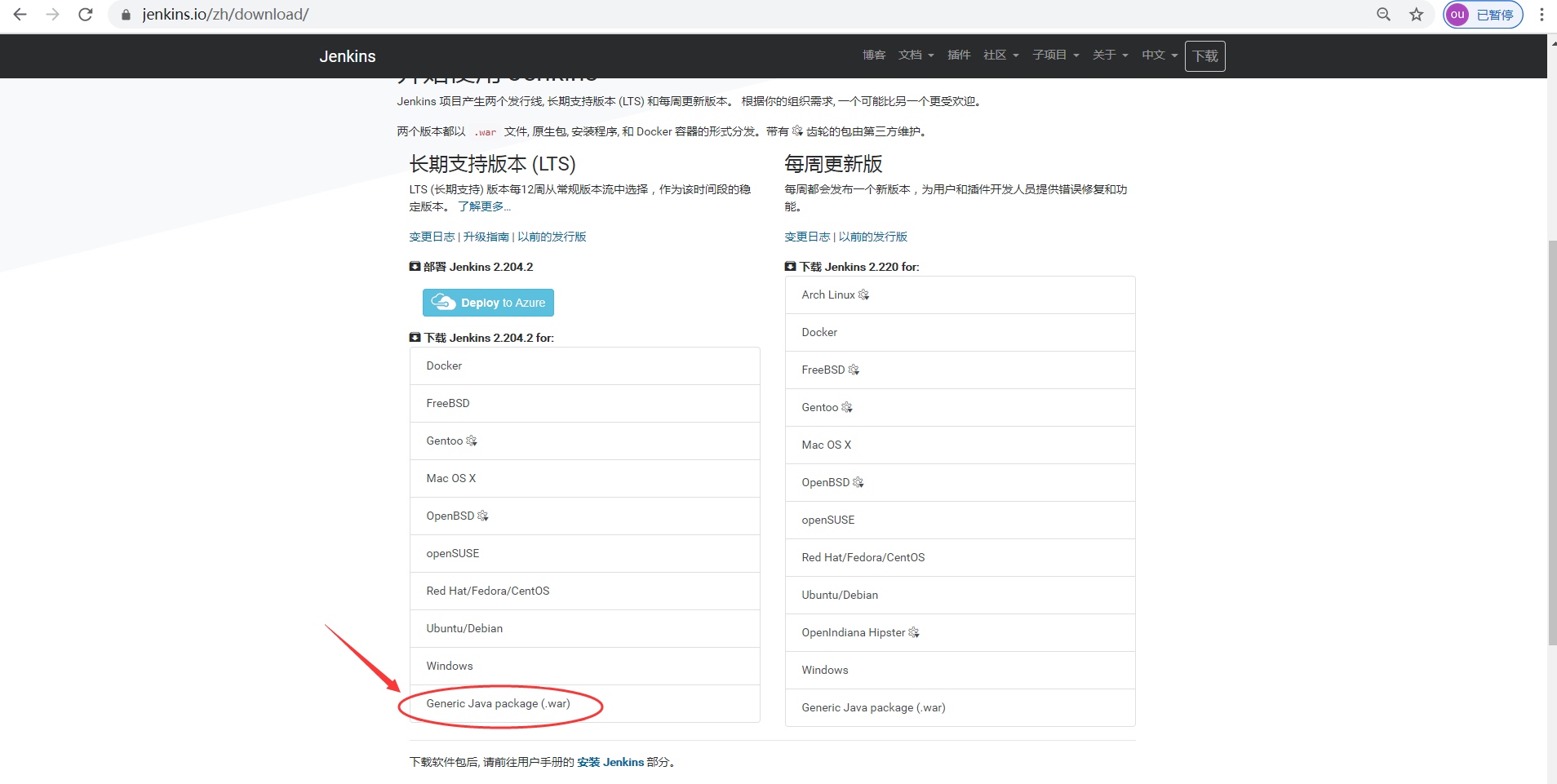 3.Jenkins 安装包推荐使用官网的长期支持版本 (LTS),避免出现插件无法安装的情况